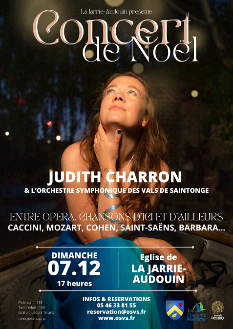 A l’occasion de ce Concert de Noël qui marque la première collaboration entre Judith et l’OSVS, nous vous proposons un programme tout en douceur, allant de Mozart (Laudate Dominum) à Jacques Brel (Quand on a que l’amour), en passant par Saint-Saëns (Le Cygne) ou encore Leonard Cohen (Halleluja). Elle chante en voix lyrique pour un répertoire de Noël (Ave Maria de Caccini) et en voix directe pour interpréter les belles chansons françaises comme "L’île aux Mimosas" de Barbara ou "Les gens qui doutent" de Anne Sylvestre... et bien d'autres.