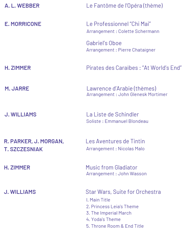 | 13 AVRIL Brizambourg Le Symphonique dans tous ses états | 10 MAI La Roche-Courbon (évènement privé) | 17 MAI St-Savinien "En fanfare" | NOUVEAU Concert festif Fête de la Musique à Annepont Vendredi 20 juin à 18h30 | 22 JUIN St-Georges d'Oléron "Nouveau Monde" | Samedi 27 SEPTEMBRE 2025 Bernay-St-Martin De Bach à Hollywood, le symphonique dans tous ses états. | Dim. 12 OCTOBRE 2025 St-Savinien Rachmaninov Verdi Lawrence d'Arabie | 23 NOVEMBRE St-Jean-D'Angély "L'Aurore" | 29 NOVEMBRE St-Pierre d'Oléron "Musique et Cinéma" | 7 DECEMBRE La Jarrie-Audouin | 13 DECEMBRE Tonnay-Boutonne |